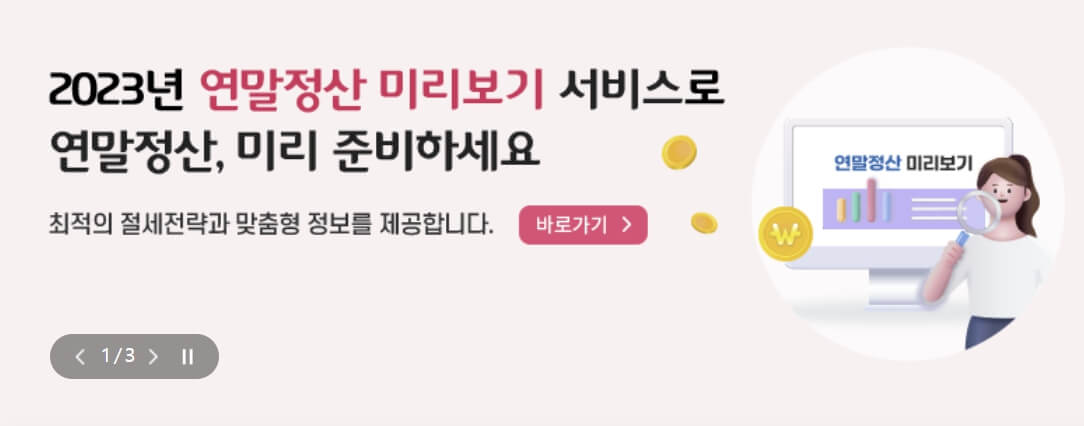 연말정산의 절세를 위해서는 최대항의 소득공제를 받아서 과세표준을 줄이고 세액공제를 받아 세금을 낮춰야 합니다. 2023년 1월부터 9월까지 신용카드 등 사용금액 확인이 가능하고 10월 ~12월 예상 카드 사용금액을 입력하면 예상 절세 금액을 모의계산으로 미리해보실수 있습니다.